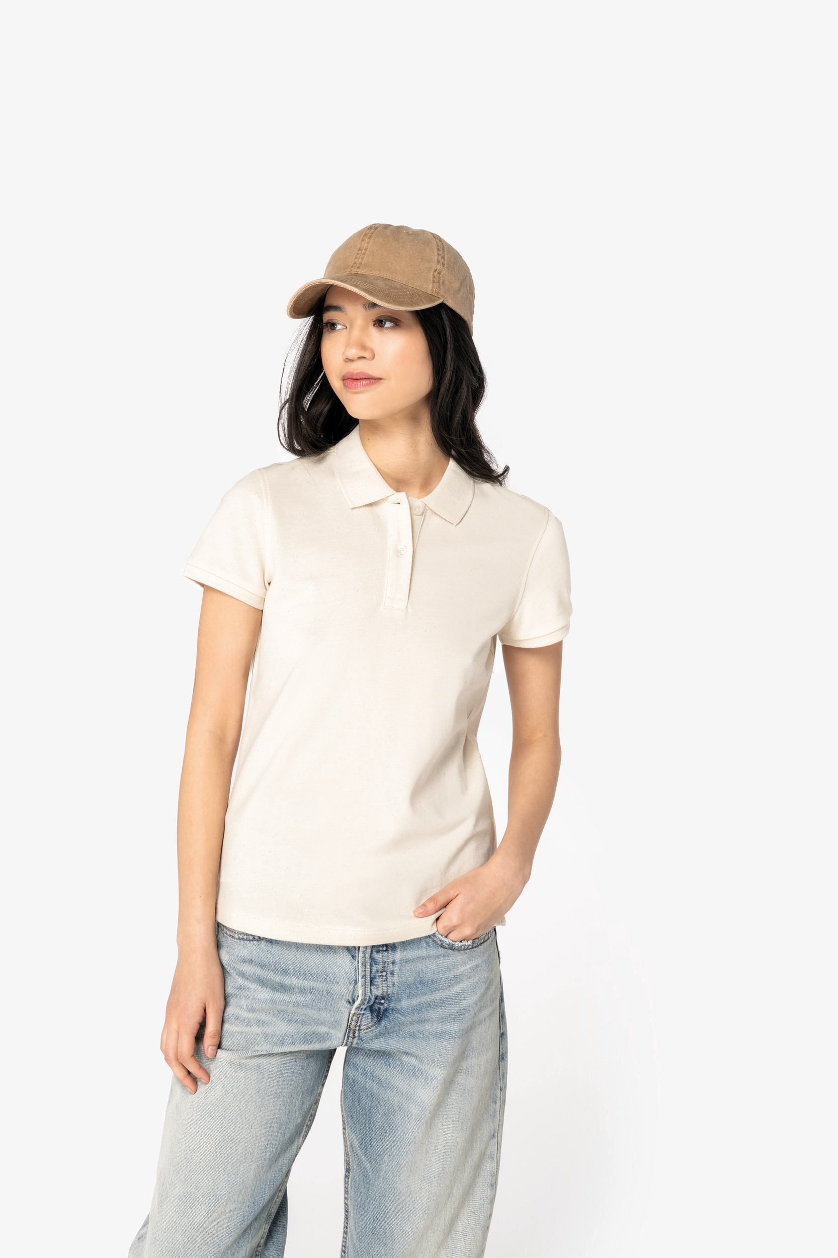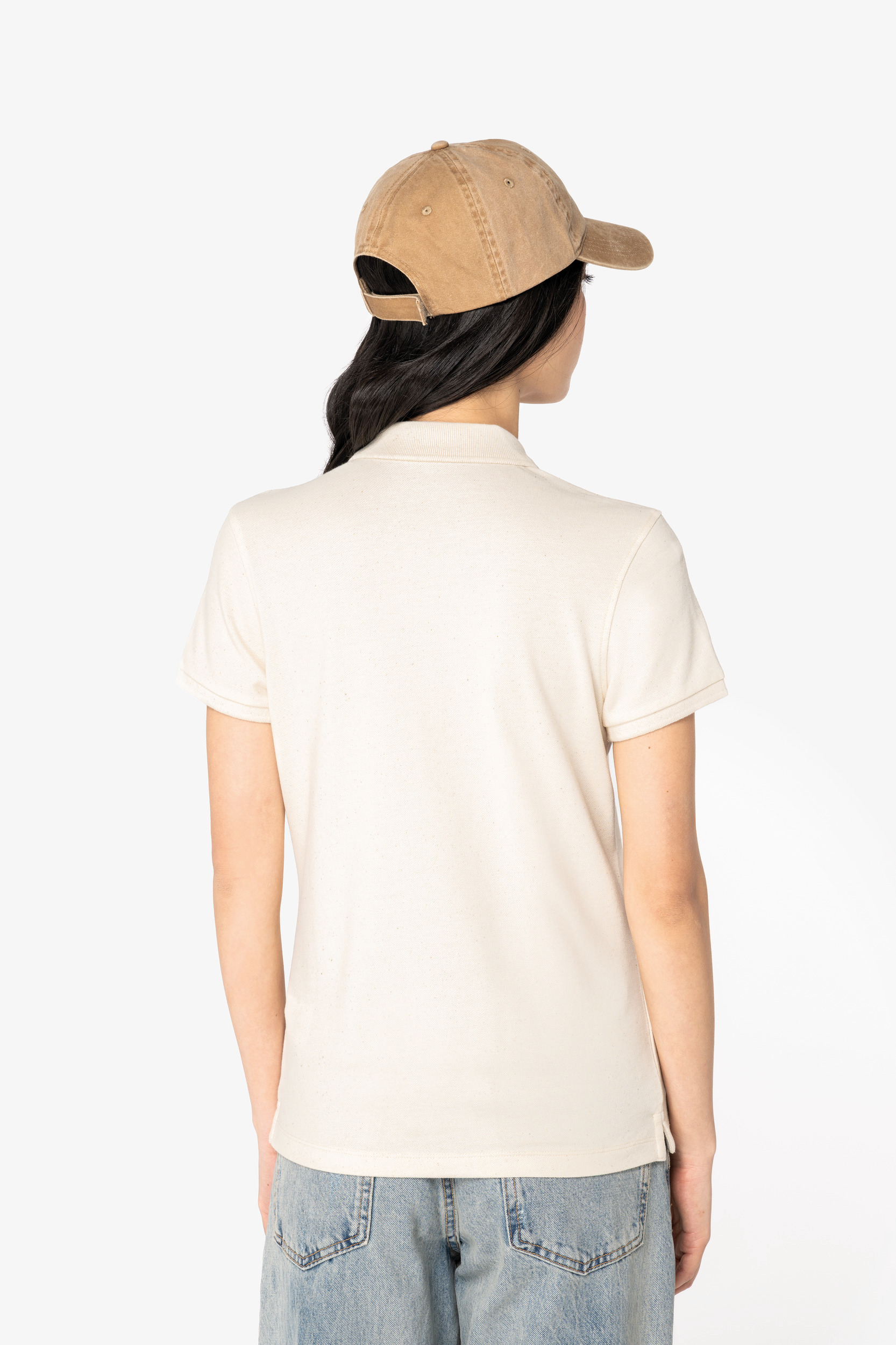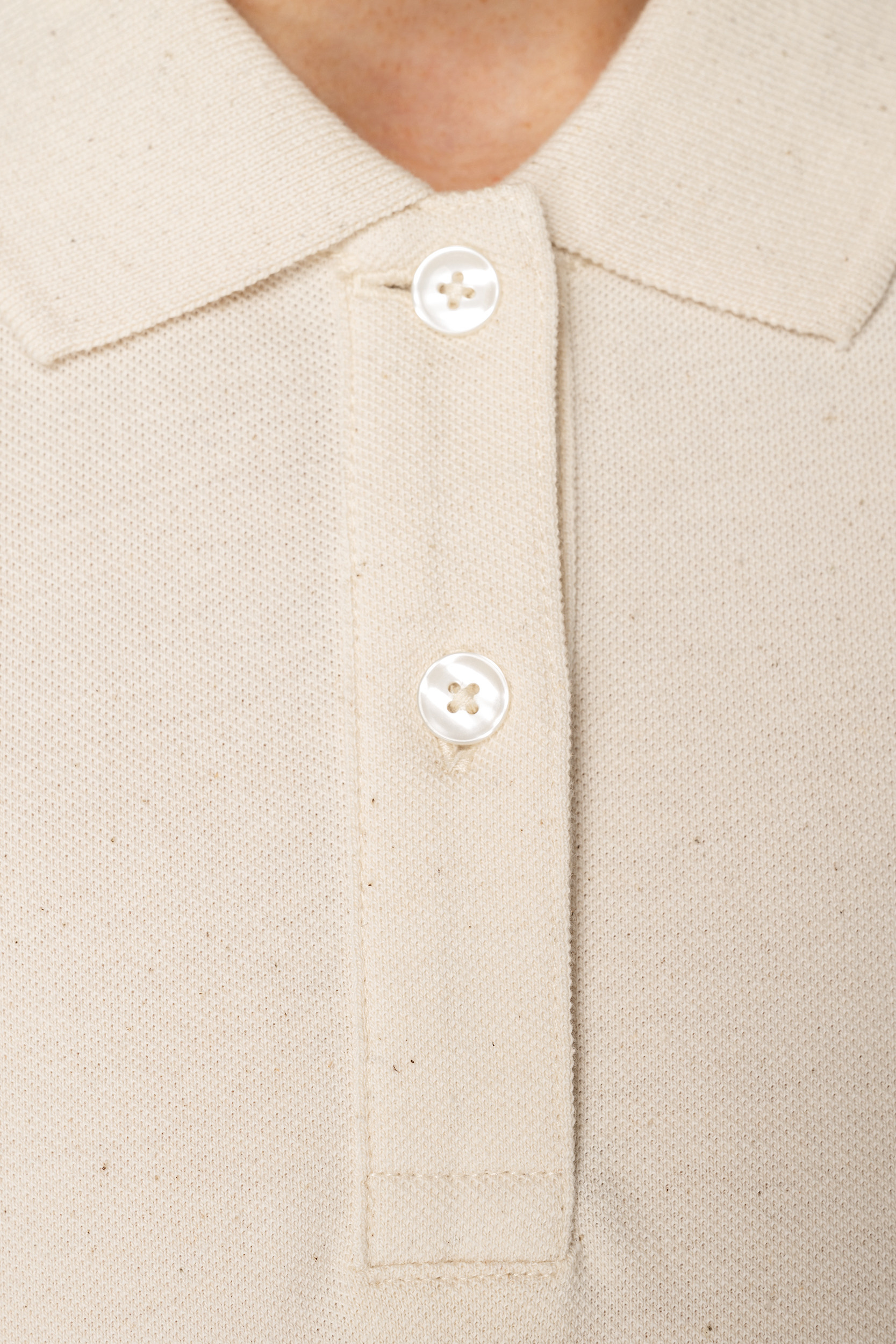 100% organic cotton. Straight fit. Combed cotton. Piqué knit. Enzyme-washed. Side slits. 1 x 1 rib neckline and cuffs. Two-button placket with ribbed finish. Pearly contrasting recycled plastic buttons. Tone-on-tone taped neck finish in the main material inside the collar. Backing at the shoulders in the main material. Twin-needle finish on bottom hem. Raw Natural is distinguished by its raw, visually textured appearance, dotted with fine particles visible to the naked eye.